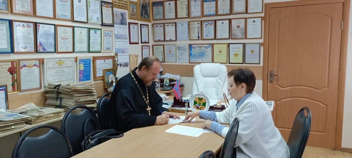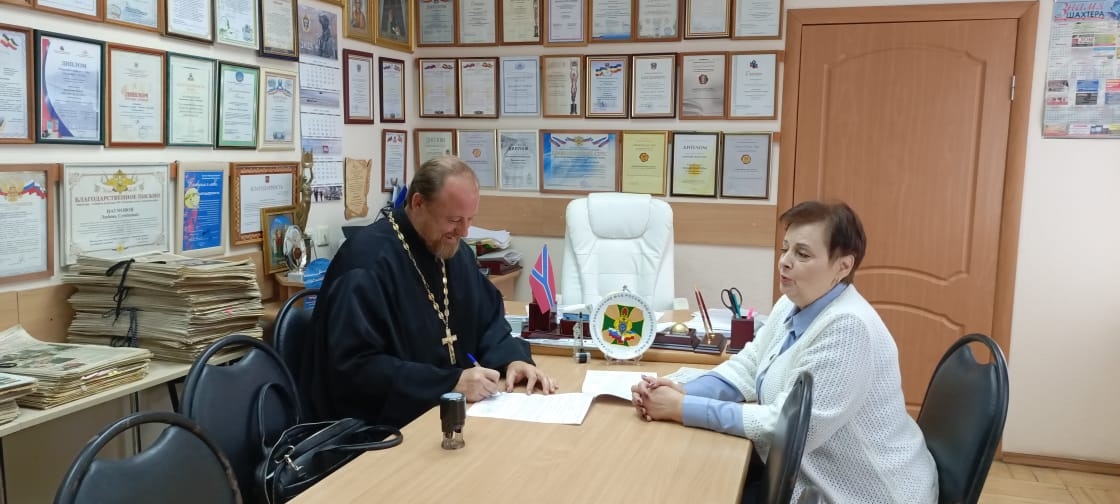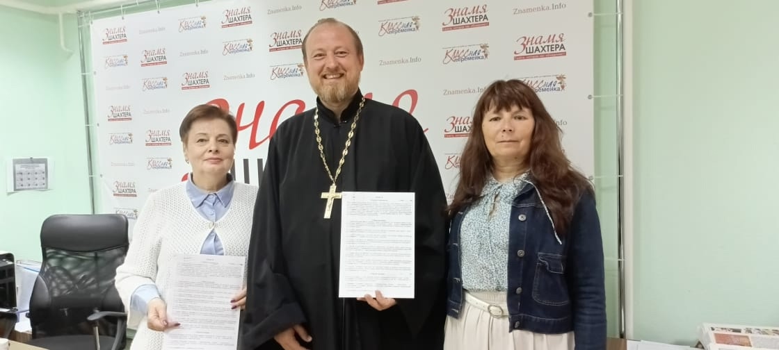 Сегодня случилось значимое событие: храм Донской иконы Божией Матери в лице его настоятеля, протоиерея Романа Амплеева, и ООО «Редакция газеты «Знамя Шахтера»» в лице главного редактора Наумовой Любови Семеновны заключили, вернее перезаключили, договор о совместной деятельности.