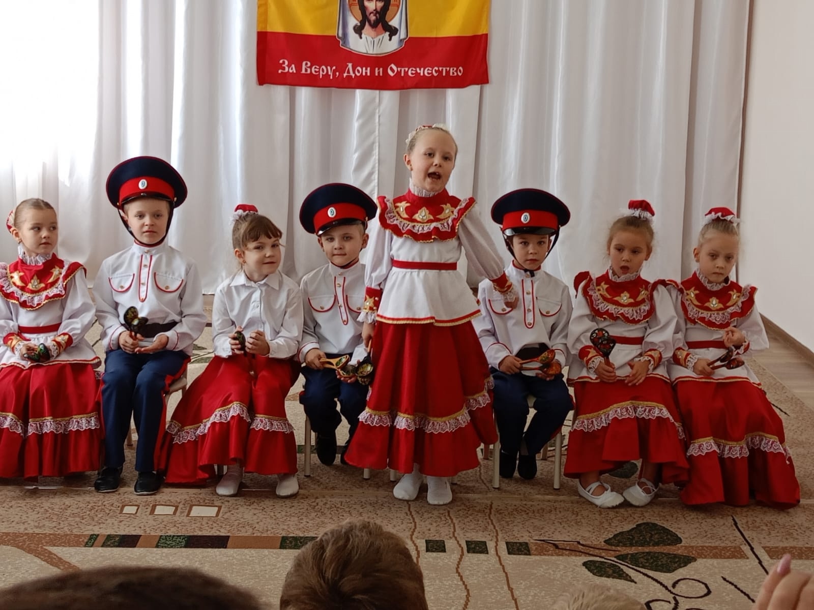 В этот день 14 октября прозвучали песни и стихи о празднике Покрова. Казачата водили хороводы и играли в различные игры: «Плетень», «Лихой казак», «Перекати поле». Юные казачата исполнили казачью мелодию на ложках «Ой при лужку…». Все присутствующие на празднике получили только положительные эмоции. А дети ещё и получили небольшое угощение от Батюшки и атамана. Благодарим администрацию детского сада в лице заведующей Надежды Сергеевны Павленко, Будылеву Ольгу Владимировну — воспитателя, и Вержбицкую Марину Вячеславовну — музыкального руководителя за сотрудничество в подготовке праздника и духовно-патриотическое воспитание детей.
