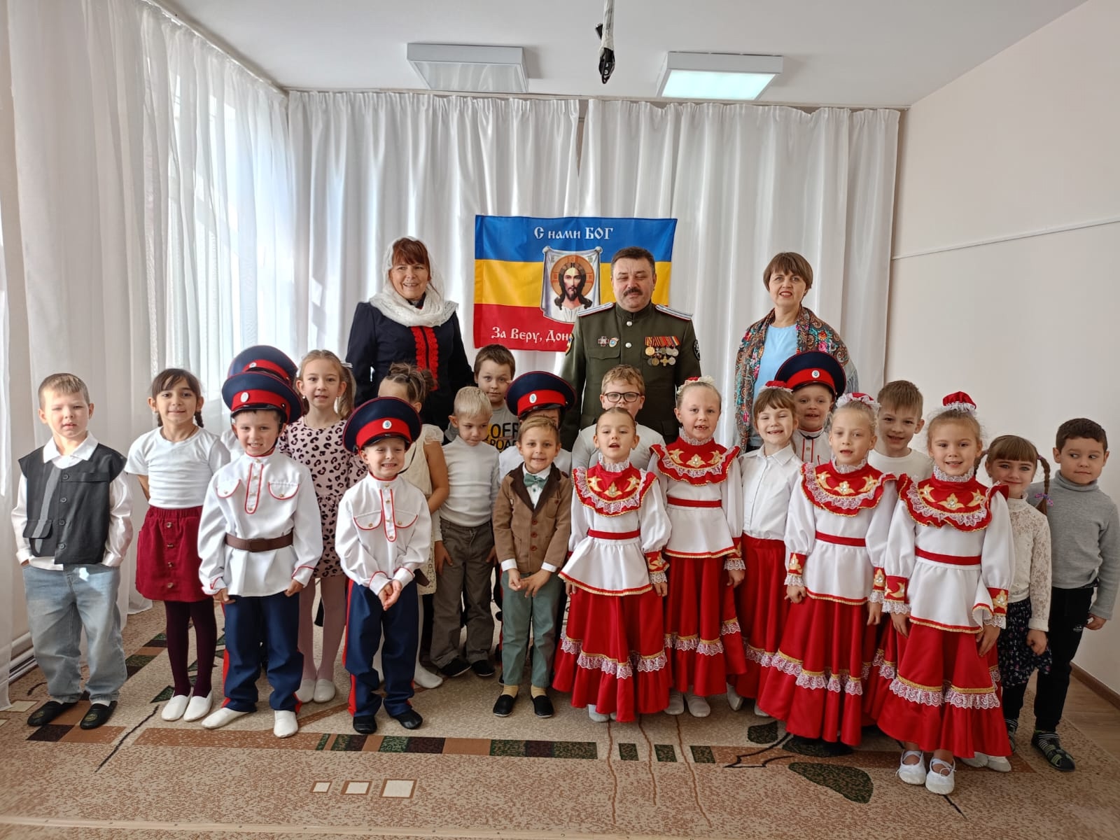 По доброй традиции в МБДОУ «Центр развития ребёнка д/с №26 «Весна»» состоялся красочный и задорный праздник, посвящённый одному из главных и самых почитаемых праздников на Дону — Покрову Пресвятой Богородицы. По благословению протоиерея Романа Амплеева, настоятеля храма в честь Донской иконы Божией Матери г. Новошахтинска, руководителя епархиальных отделов Шахтинской епархии по взаимоотношению Церкви с обществом и по взаимодействию с казачеством, воспитанники детского сада в преддверии праздника посетили храм Донской иконы Божией Матери. Инна Викторовна Саханина познакомила ребят с историей праздника и традициями празднования его на Дону. Также перед ребятами выступил Сыч Владимир Фёдорович, член правления, атаман станицы Мало-Несветаевская Международного Союза общественных объединений «Всевеликого Войска Донского».