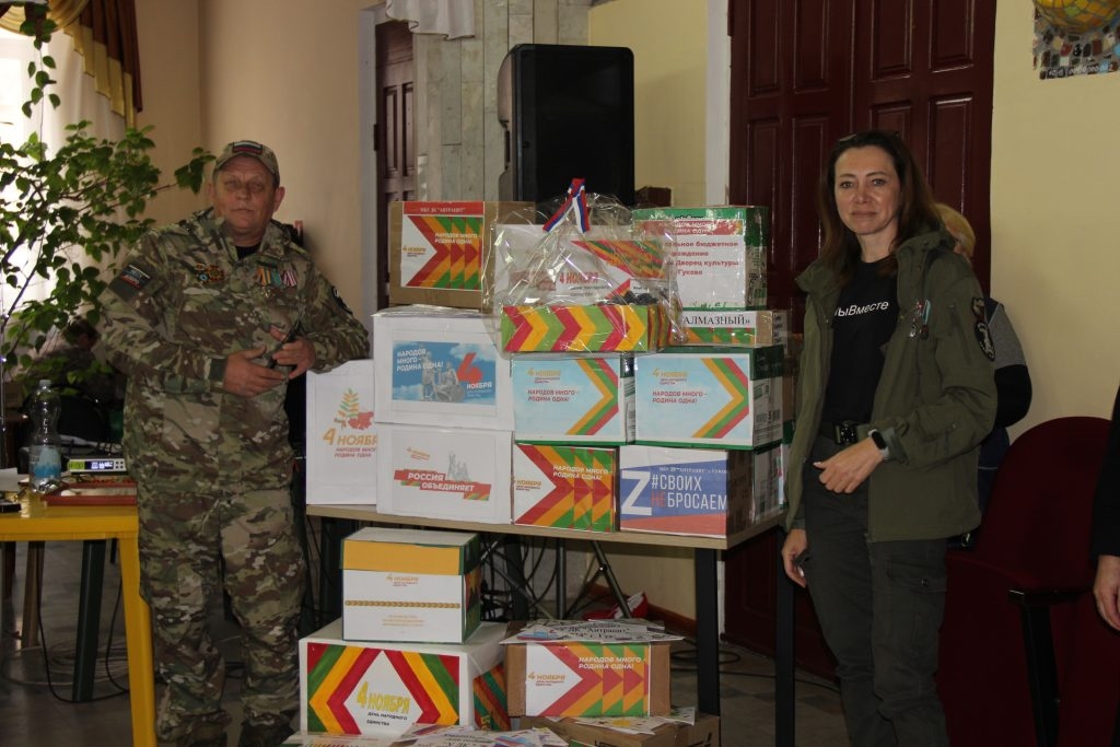 Когда все презентации подошли к концу, на сцену для приветствия и награждения участников пригласили заведующую Отделом культуры Администрации города Гуково, Марину Николаевну Короткову. Она поблагодарила все делегации за этот красочный калейдоскоп культур разных народов. Кроме того, на фестивале объявили, что учреждения культуры собрали очередную партию гуманитарной помощи для участников СВО. Коробки передали гуковской волонтерской группе #МЫВМЕСТЕ, чтобы они доставили их ребятам на передовую.