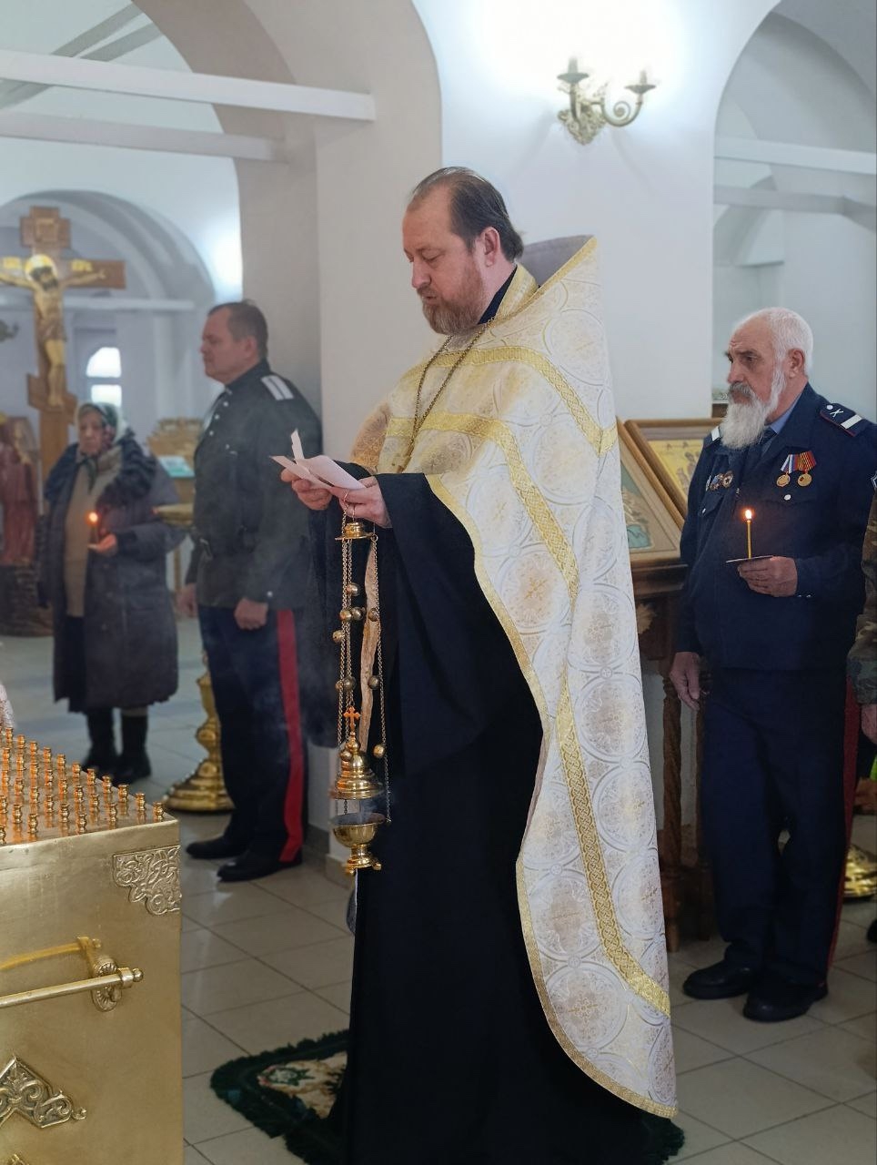 Заупокойное богослужение совершил протоиерей Роман Амплеев, настоятель храма, руководитель Отдела по взаимодействию с казачеством Шахтинской епархии, духовник Черкасского округа и станицы Мало-Несветаевской МСОО «ВВД», вместе с духовником молились Владимир Федорович Сыч, общественный деятель, президент благотворительного фонда «Солидарность. Добро. Милосердие.», атаман Станицы Мало-Несветаевской Черкасского округа МСОО «Всевеликое Войско Донское», Анатолий Михайлович Ласткин, председатель Совета Ветеранов г. Новошахтинска, заместитель атамана ГКО «Новошахтинское», казаки.