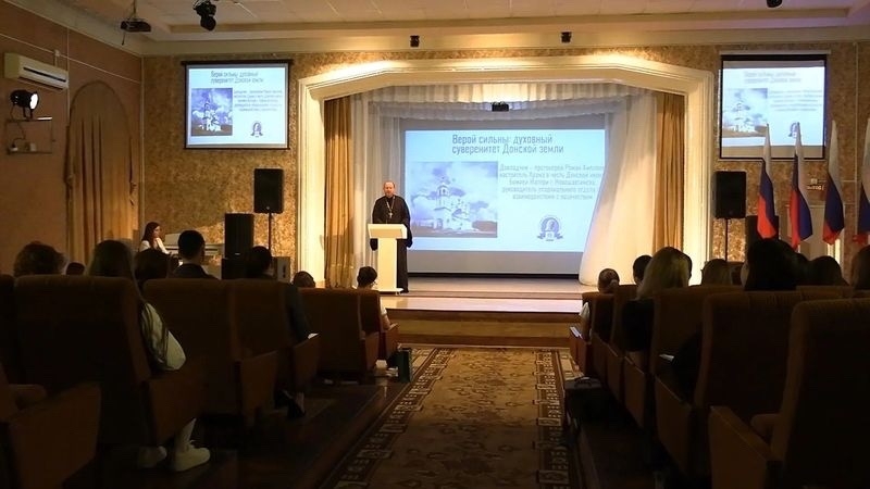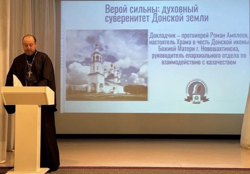 С докладом «Верой сильны: духовный суверенитет Донской земли» выступил настоятель Донского храма, руководитель отдела по взаимодействию с казачеством Шахтинской епархии протоиерей Роман Амплеев. В своём выступлении он подчеркнул важность духовных скреп в воспитании подрастающего поколения.